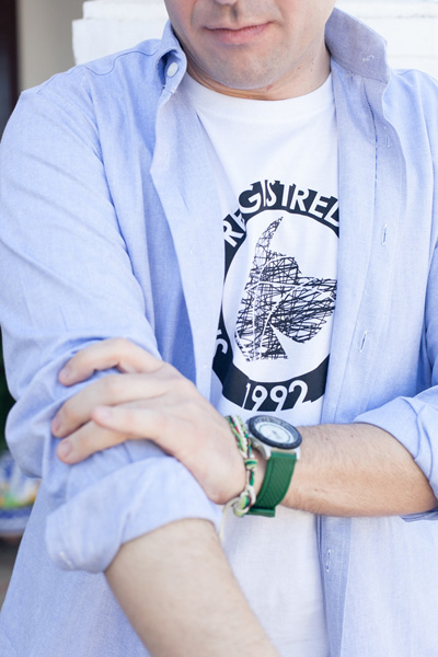 El verde del reloj contrasta con el blanco y el azul de camiseta, jeans y camisa